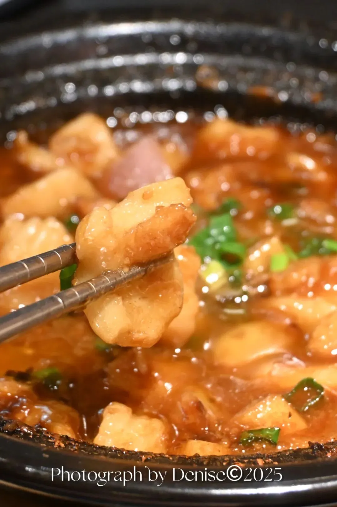 这“碟鱼头”应该就是“鲽鱼头”,肉质很软滑,比起另外两道菜,这鱼的调味算是最“轻”,调味没入到鱼肉里,还可以;但这鱼种吃起来就不鲜甜,按照粤语的说法,就是有点“木独”。
