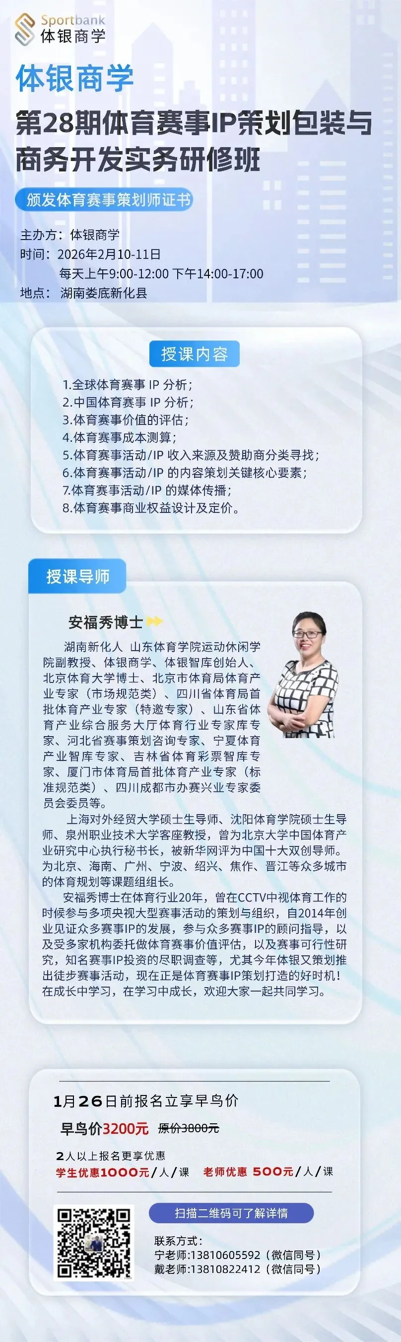 体银智库提供各城市/区/县/协会/企业等体育十五五发展规划、体育产业咨询、体育项目规划、体育项目运营策划、体育赛事价值评估、专项资金申报、体育项目可研、体育案例库建设、户外运动目的地规划、体育数据调研、户外运动目的地项目落地策划、投资、运营等提供服务,欢迎沟通合作。体银智库创始人安福秀博士微信13910189408