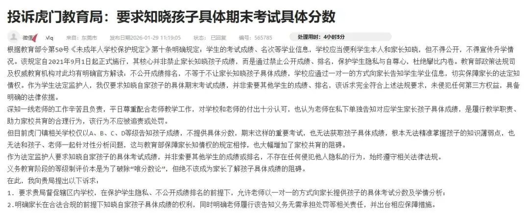 这段时间,各学校陆续进行了本学期的期末考试并开始放寒假。家长们也急迫的想知道自家孩子考了多少分、这学期学得怎么样,但是学校和老师公开学生成绩的方式,引来不少家长的吐槽。近日,东莞市某民办学校就因为未向家长公开学生的期末考试成绩、只向家长告知学生期末考试的等级评价,引发家长们的广泛不满。情况是这样的,该校本学期的期末考试已经结束好几天了,老师也已经改完试卷,家长们都在班级群里询问孩子的成绩出来了没有。结果班主任的回复是这次的期末考试成绩会以ABCD等级评价的形式呈现,并表示学生具体的分数自己也不知道。班主任此话一出,家长们立即炸锅了,纷纷强烈要求公布学生的具体分数。有家长表示,如果学校不公布孩子期末考试的分数,会到教育局投诉,花了几十万元学费,学校连分数都不说,这样说不过去。有家长质问班主任,不公布成绩是什么意思,难道中考也不看成绩吗?高中也按ABCD等级评价来录取行不行?有家长撂下狠话,如果学校不让家长们知道自己孩子期末到底考了多少分,就集体投诉。实际上,该校之所以不向家长告知学生的考试分数,是有原因的。在此之前,虎门有一名小学生家长在问政平台上留言,称其孩子的数学老师每次都把分数写在试卷上并让家长签字,这样做让家长及孩子都带来了压力,要求有关部门管一管。然后虎门镇教育管理中心要求涉事学校调整试卷反馈方式,后续评卷后将采用等级评价(如A、B、C、D)替代具体分数。受此事影响,为了避免不必要的麻烦,东莞的中小学纷纷采用等级评价替代具体分数,于是就有上述一幕。眼见孩子都放寒假了,学校和老师始终不肯(不敢)告诉自己孩子考了多少分,东莞的很多家长彻底不淡定了,纷纷在问政平台上喊话教育局,要求公开学生的考试成绩。这些家长都认为,家长作为学生的监护人,又是出钱供学生读书的人,对孩子的考试成绩具有知情权,如果只是为了保护学生的隐私和自尊心,学校和老师把学生的考试成绩“一对一”告知各自的家长就是了,给家长们看模棱两可的ABCD等级评价?家长连孩子学得怎么样都不知道,还怎么辅导孩子学习?不等于“开盲盒”吗?将来孩子中考考不上普高,教育局和学校可以为他们的未来负责吗?也有家长建议,关于学生考试成绩的公布方式可以按需分配,哪个家长不需要知道孩子考试成绩的、哪个学生接受不了自己考了多少分的,学校和老师就给他们发等级评价;其余希望知道孩子考试成绩的家长、可以承受自己考试表现的,就“一对一”告知他们具体的分数应该说,家长们要求学校、老师告知他们孩子的考试分数的诉求是合理的。家长作为监护人,对学生的在校学习情况具有知情权。虽然教育部明确禁止学校及教师公开学生的成绩和排名,但并不等于剥夺家长对孩子成绩的知情权,并且教育部政策法规司及权威教育机构均有明确官方解读:学校及教师应通过“一对一”的方式向家长告知学生学业信息,切实保障家长的法定知情权。所以说,学校及老师仅以A、B、C、D等级告知家长孩子的成绩,而不是具体分数,涉嫌侵犯了家长的知情权。维护家长对孩子考试成绩的知情权,也是促进家校共育和教育良性发展的有力保障之一。家长只有知道孩子考得怎么样,才能精准掌握孩子的知识薄弱点,进而帮助孩子明确接下来的学习目标与方向,促使学生有针对性的查漏补缺,不断取得进步。并且家长只有知道孩子准确的学业信息、了解孩子存在哪些问题,才会觉得有必要配合学校、教师的工作。如果家长对孩子在学校的学习表现只是一知半解,学校、老师与家长之间就失去了一个非常重要的信任前提,家校共育就失去了基础,甚至学校、老师平时的很多要求都会被认为是在“没事找事”,工作更加难以展开。原因很简单,家长连孩子的考试成绩都不知道,那么他们自然不会觉得孩子平时有什么问题,既然孩子在学校的表现好,为什么学校和老师还三天两头这么多事情?难道不是在区别对待他们的孩子?更加关键的是,人生存在社会中,竞争是无处不在的,必须要有自己的竞争力、要不断进步,同时竞争又是促使每个人认清自我、不断变强的源动力之一。在学校里,平时的考试尤其是期中、期末考试就是学生适应社会竞争机制、培养竞争意识和能力的最主要方式。通过一次次考试中的表现,他们可以不断的改进提升,以及锤炼自己的精神和意志。但学生如果连考试的成绩都不敢面对、不懂得从考试中总结经验教训,那么他们的竞争意识和能力就很难培养起来。当他们走出学校,接受社会的残酷竞争时,会变得弱不禁风,毫无抗压能力强,接受不了一点挫折与困难,就像温室里的花朵一样。保护学生的隐私和自尊心跟告知家长学生的考试成绩之间并不是只能“二选一”的绝对关系,学生会不会因为家长知道了考试的具体分数而“受伤”,关键在于学生及家长对待考试成绩的态度。当家长能够理性看待孩子的成绩,得知孩子考了多少分后,是聚焦在孩子的学习情况以及能力的提升上,而不是纠结于成绩排名的攀比,这时学生大概率不会觉得隐私和自尊心受到侵犯。因为家长会根据他们的考试成绩,引导他们正确看待成绩,学会从考试中找到自己的知识薄弱点以及学习过程中学习态度、学习习惯的问题与不足,然后明确接下来的学习目标与方向,针对性的查漏补