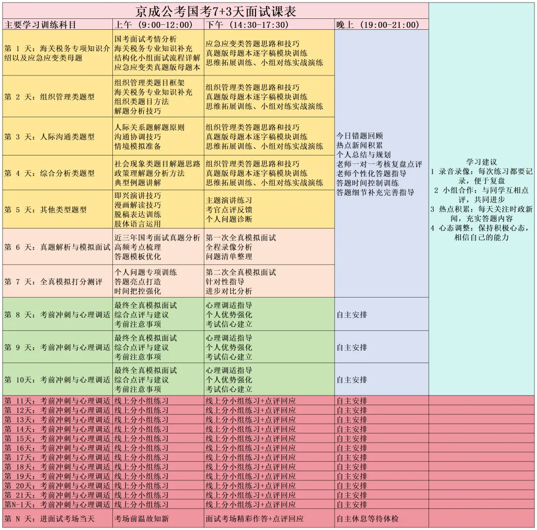 京成公考:采用“7+3+N”讲练模式,即7天固定课程+3天自由练习续住+ N天线上集中复盘练习,确保学员有充足时间巩固知识、提升实战能力。具体班型选择可根据个人经济状况、报考岗位竞争程度及学习需求综合考虑。