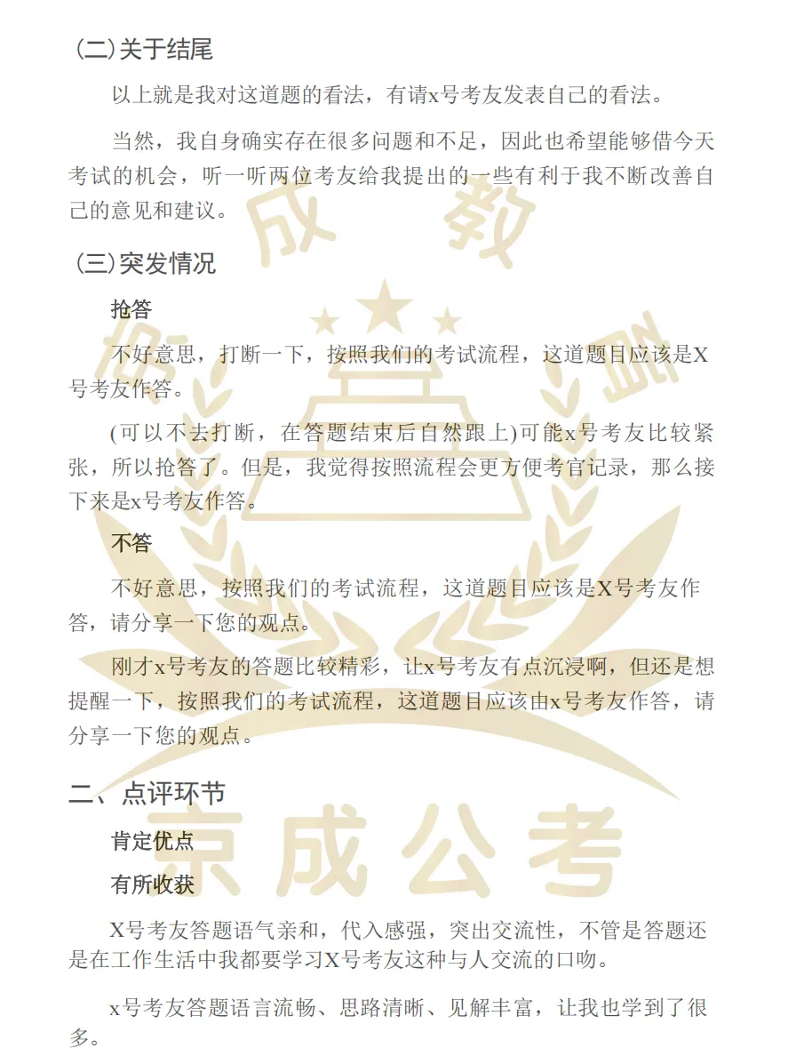4. 高线底线保障,岗位更加牢固——京成公考在面试培训过程中,对学员开展冲刺和兜底训练。高线,就是京成公考给你一套能冲90+的答题范式,目标是让考官眼前一亮。底线,就是万一你发挥失常,京成公考也给你一套"万能利器",保证守住基本盘。这套底线打法,足以秒杀市面上多数机构的"高分答案"。