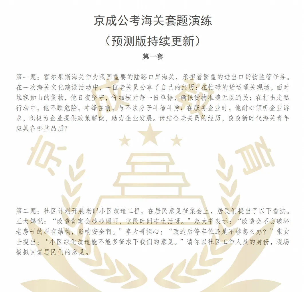 京成公考深耕海关面试多年,是能够对海关、税务面试真题、海关、税务年度热点、海关、税务优秀事例、海关、税务面试预测做到精准教研的团队。2024年、2025年命制的面试模拟预测题精准命中多道海关、税务面试题,提供的热点预测方向及素材,为考生针对性作答、呈现独家特色提供了充足弹药。可以说:精准教研,是我们能够在海关、税务面试方向上独树一帜的关键所在!