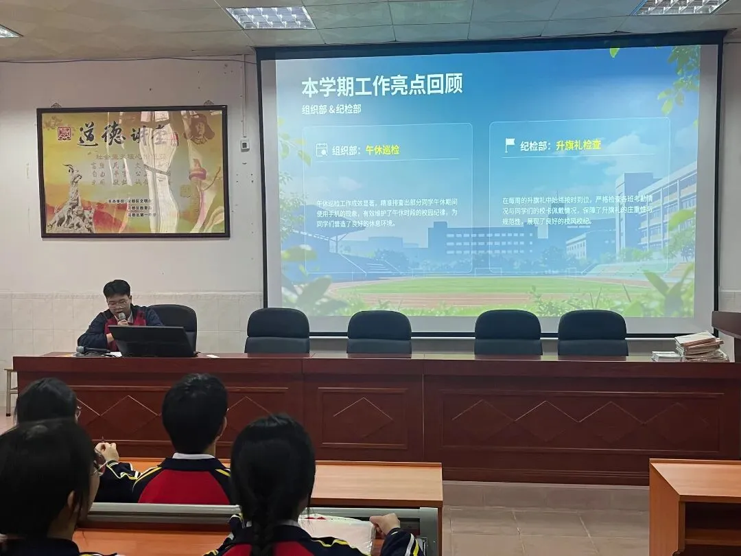 回望本学期的亮点工作,各部门各司其职、各展所长,用专业与坚守为校园秩序与文化建设添砖加瓦。组织部的午休巡检工作成效显著,部门伙伴们坚守岗位、认真负责,精准排查出部分同学午休期间使用手机的现象,有效维护了午休时段的校园纪律,为同学们营造了安静有序的休息环境,也助力了学校学风建设的推进;纪检部在每周的升旗礼中展现了高效的执行力,始终按时到位,严格检查各班考勤情况与同学们的校卡佩戴情况,以严谨的态度保障了升旗礼的庄重性与规范性,强化了同学们的集体意识与规则意识;礼仪部的工作兼具严谨与温度,晚修前的仪容仪表检查细致入微,及时纠正不规范现象,维护了校园良好风貌;在各类颁奖仪式上,礼仪部伙伴们以专业的仪态、得体的举止完成颁奖环节,为活动增添了仪式感,展现了我校学子的良好形象;宣传部则是校园动态的忠实记录者,无论是各类活动的现场摄影,还是日常工作的影像留存,部门伙伴们都用镜头捕捉精彩瞬间,为校园文化宣传提供了丰富的素材,让更多人了解学生会的工作与校园的美好。