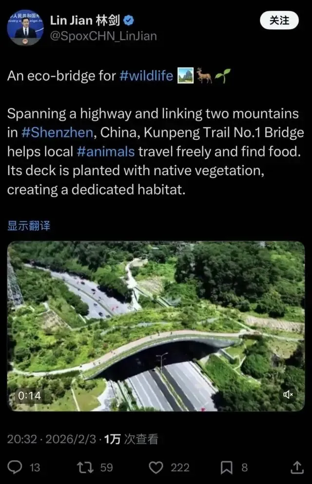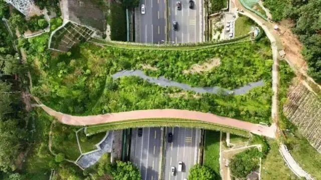 林剑在帖文中写道:“鲲鹏径一号桥横跨公路,连接中国深圳境内两座山脉,为当地动物自由活动和觅食提供了便利。桥面上还铺设有本土植被,形成一个专门的栖息地。”