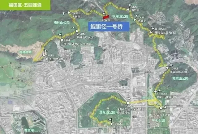 鲲鹏径一号桥的建成,不仅实现了生态断点修复,提升了区域生态格局的稳定性,更为市民提供了亲近自然的便利。正是这座桥,使深圳中部的“五园”——梅林山、银湖山、笔架山、莲花山、中心公园实现生态、无障碍的互联互通、连片成网。