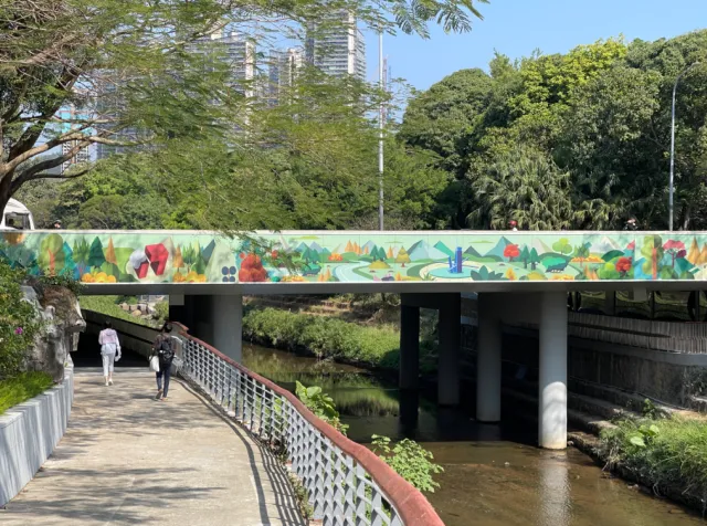 进入中心公园,沿着福田河,公园内跨多条道路的6个涵洞、人行道等被整体改造提升,融入了微缩景观、彩绘等,通行体验更加舒适。