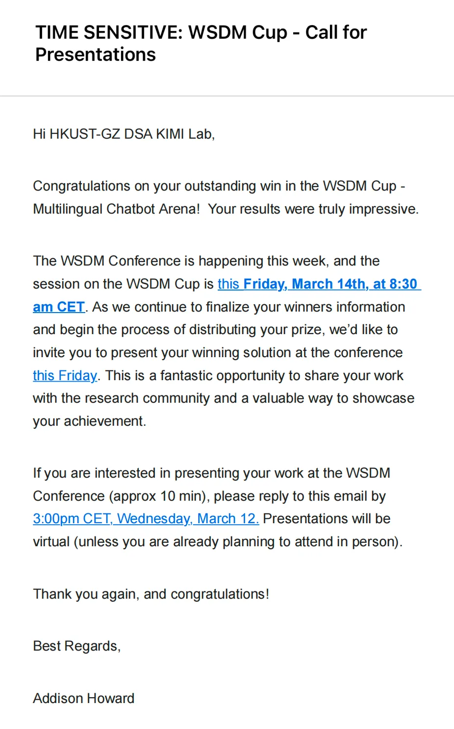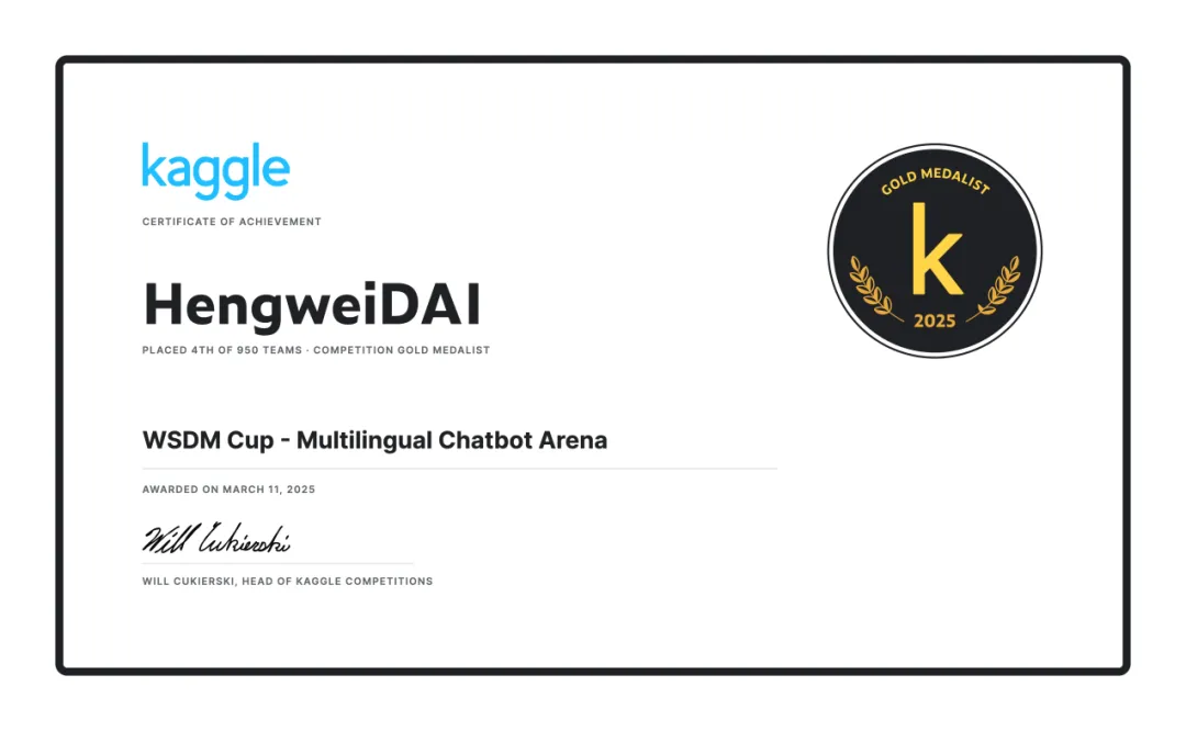 “人工智能是年轻的事业,也是年轻人的事业……寄希望于年轻人。”习近平总书记的嘱托,是戴亨玮深耕AI领域的初心动力。在WSDM Cup 2025,他设计的“多源数据价值对齐+蒸馏训练”方案,将大模型误导性回复占比降低71.4%,从全球1000余支参赛队伍中突围,击败多支英伟达、字节跳动专家坐镇的顶尖团队,斩获国际赛事金牌,获邀赴德国汉诺威国际会议分享。作为谷歌AI竞赛社区世界前0.1%的顶尖选手,他以00后之姿,在国际舞台擦亮中国青年技术名片。