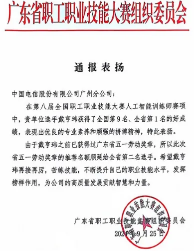“只有让智能化理念深入人心,AI才能成为生产力”,作为IT及业支/综支中心首位高级专家,戴亨玮带动本部门专利从0突破至年13篇,协助青年骨干打造智能数据助理、催缴外呼、一线问答、工单分派等实用工具;以赛促学,斩获“羊城工匠”称号、全国职工职业技能竞赛第九名(广东最佳),引导11名同事获省市级竞赛荣誉。入职不到两年成为“广东省五一劳动奖章”的00后最年轻获得者之一。其成长故事纳入集团精品党课案例,带动青年群体在基层实现“技能成才”。