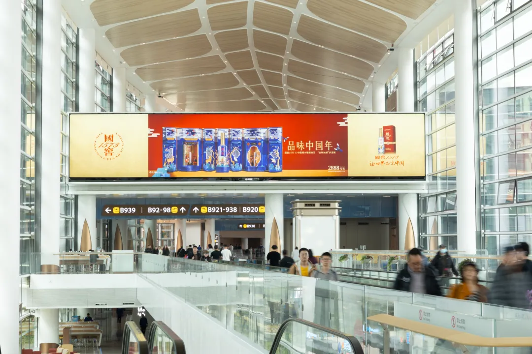 国窖1573的策略布局聚焦于长期品牌建设与节点氛围营造的双重目标。位于国内出发到达混流区上方的核心灯箱,是品牌长期形象展示的高地,该点位坐落于出发与到达双向人流的交汇处,覆盖面广、人流量大,巨幅画面与居高临下的位置,吸睛醒目,能够持续覆盖双向流动的优质客群,奠定稳固的高端品牌认知。切合国窖1573整体“以机场核心区域灯箱媒体为主”的投放目标。
