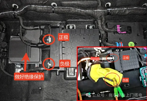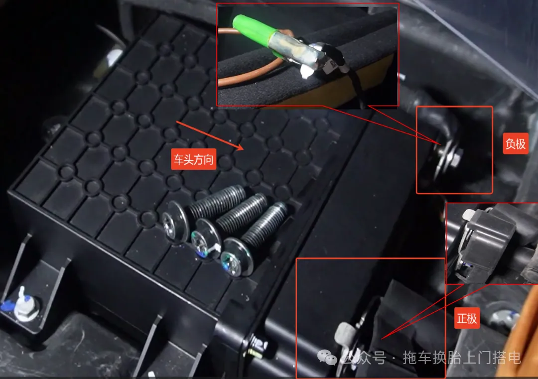 🔺 注意:车辆蓄电池室锂电电池,禁止使用搭电宝进行操作。拆下负极桩头时请做好绝缘保护避免出现短路现象