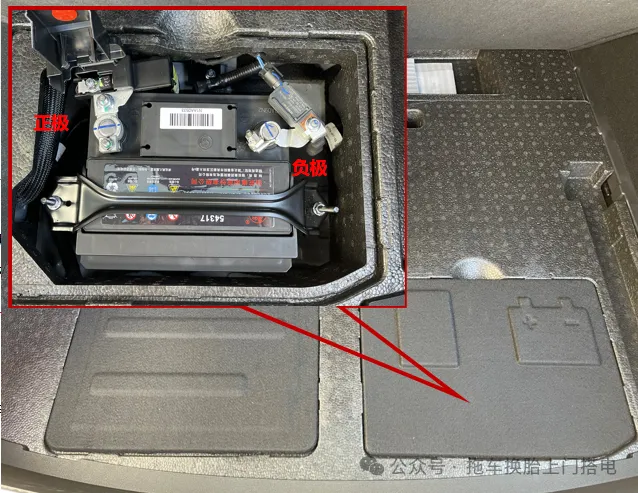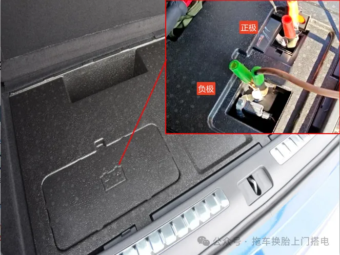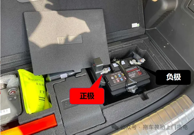 问界M5车辆搭电位置发生变化,搭电需要对后备箱护板下方电瓶进行跨接搭电。