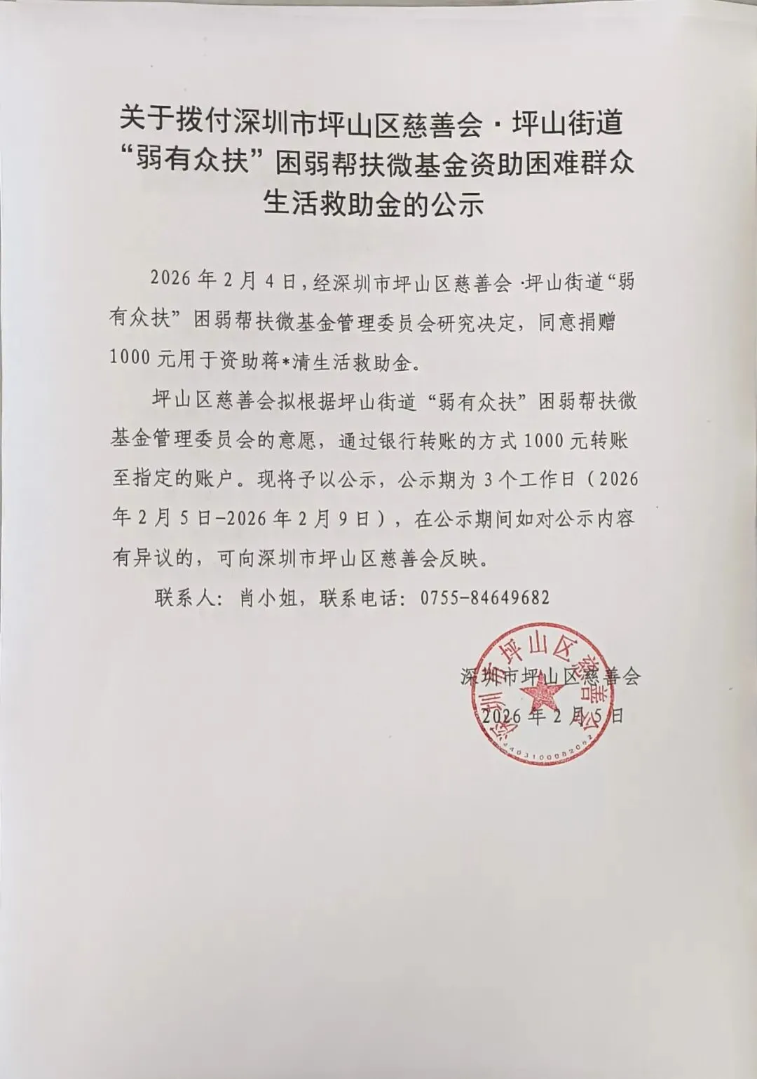 2026年2月4日,经深圳市坪山区慈善会·坪山街道“弱有众扶”困弱帮扶微基金管理委员会研究决定,同意捐赠1000元用于资助蒋*清生活救助金。