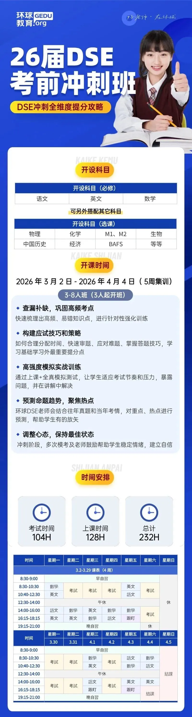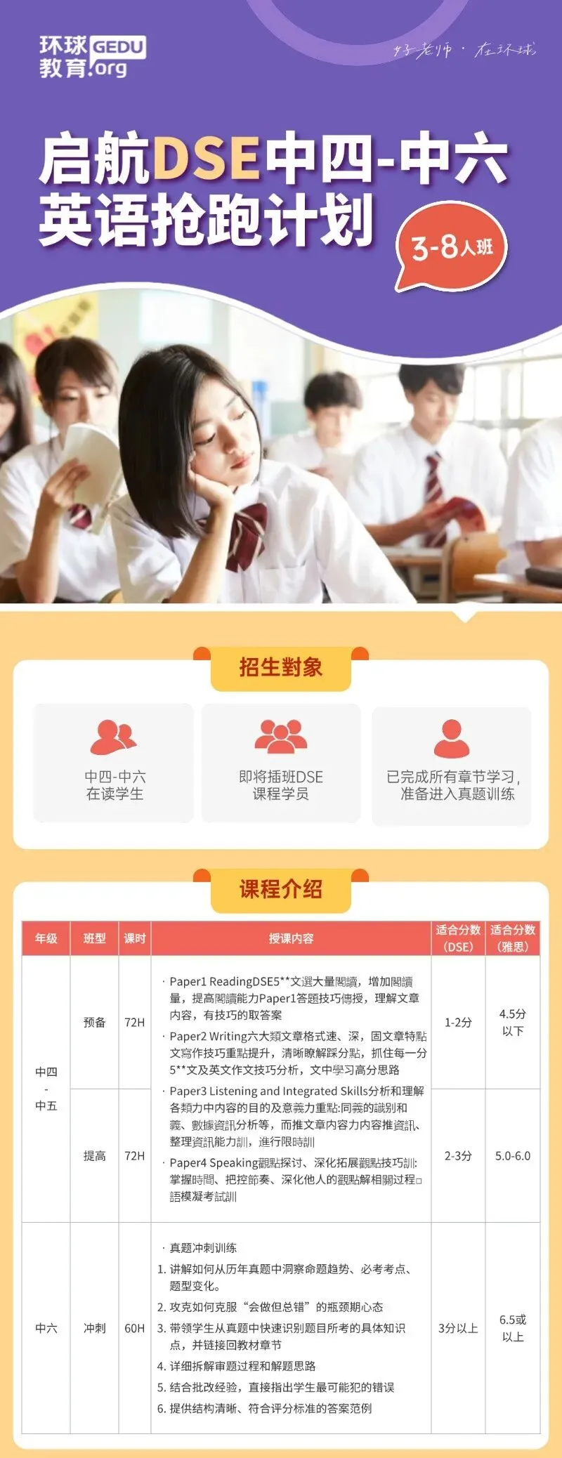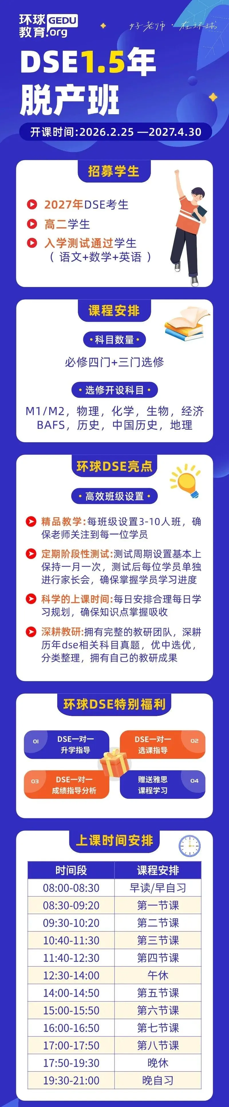 深圳环球DSE全日制课程为2027届DSE考生量身打造,适合目前高二或高三、希望系统备战DSE的学生。