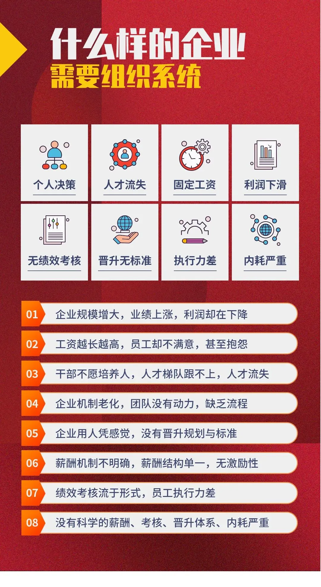 企业组织系统是企业的基础管理系统,是企业从成长走向成熟,必须建立的健康利润型内部体系,是企业构建管理系统化、团队化、流程化运作第一步。
