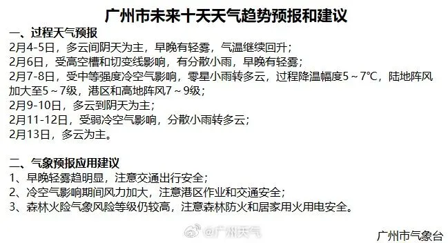 广州市气象台预计,2月6日广州云量较多,早晚有轻雾,有分散小雨。2月6日夜间~8日受中等强度冷空气影响,广州零星小雨转多云,冷空气影响过程降温幅度5℃~7℃,陆地阵风加大至5级~7级,港区和高地阵风7级~9级。2月7日广州最高气温将降到“1字头”。