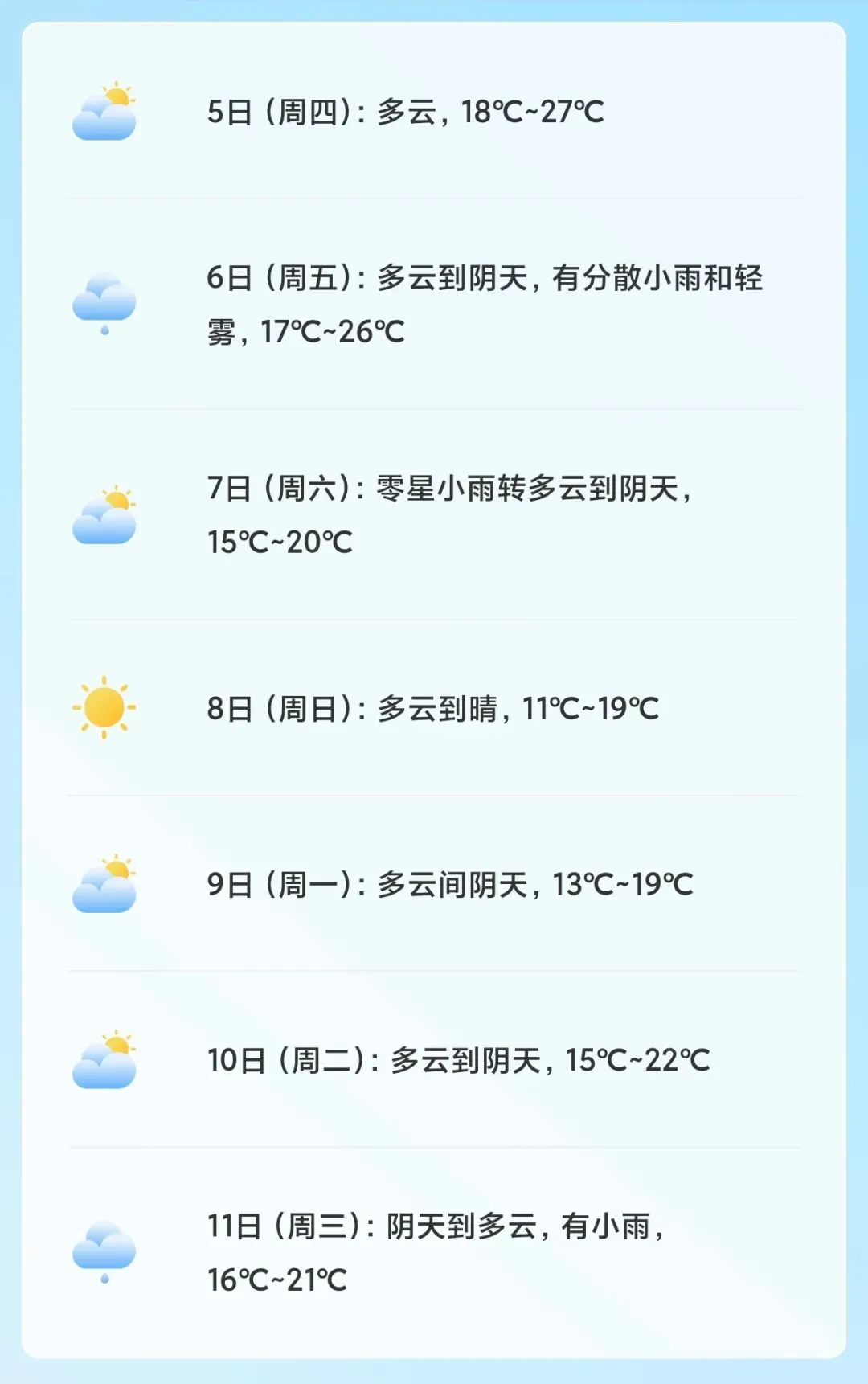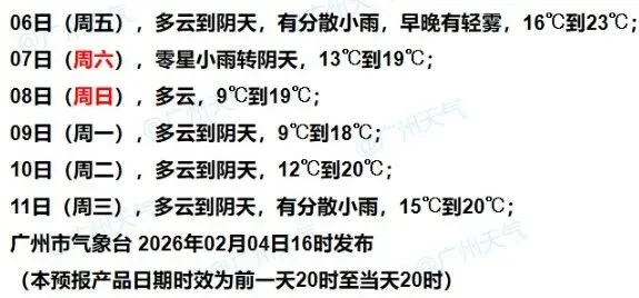 6日,粤北市县阴天,有小雨,其余市县多云到阴天,有分散小雨,大部分市县早晨有轻雾或雾,傍晚到夜间气温自北向南逐渐下降。早晨最低气温:粤北和珠三角北部市县12℃~15℃,南部沿海和珠三角中南部市县18℃~21℃,其余市县15℃~17℃。