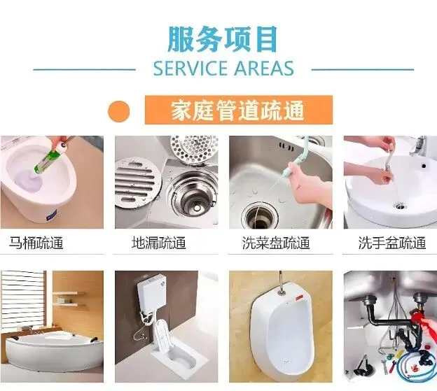 疏通下水道、马桶、蹲厕、地漏、下水管;维修马桶漏水、水管;卫生间除臭、反味处理;疏通脸盆、菜盆、墩布池;疏通主管道、疑难管道、市政管道、工业管道;提供高压清洗车、抽粪车服务;上下水管安装、改管、维修。