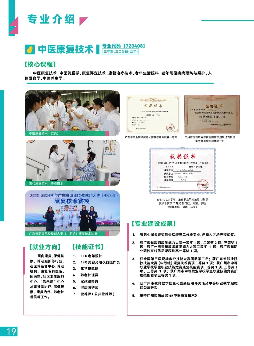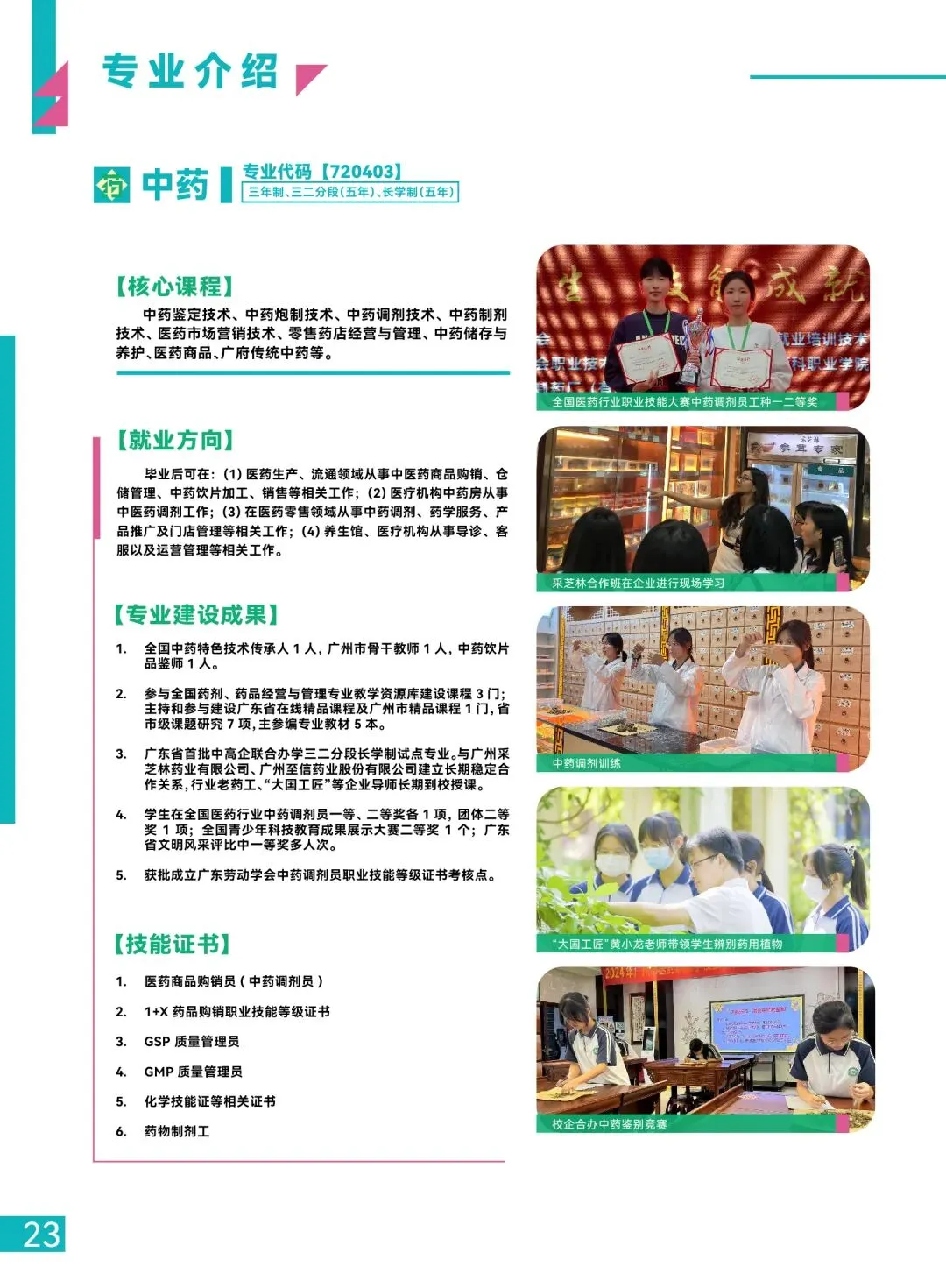 ·学校概况:广州市医药职业学校创立于 1964 年,是全日制公办国家级重点职业学校,隶属广州市教育局。学校有凰岗、花都和增城三个校区,校园面积共 450 亩。专业设置以药剂和中药为主,同时涵盖生物技术制药、食品化妆品检验等多个专业,是广州市唯一一所以中医药为特色的中等职业学校。