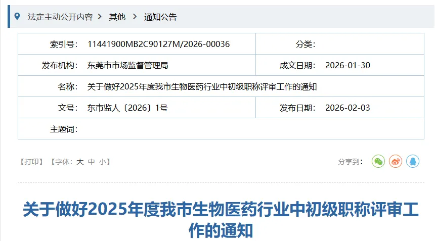 东莞市市场监督管理局发布了《关于做好2025年度我市生物医药行业中初级职称评审工作的通知》,具体情况如下: