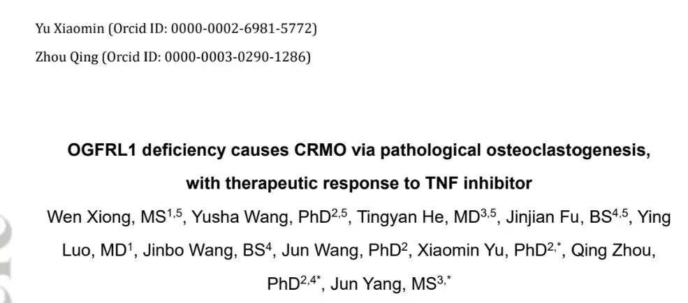 文章标题:OGFRL1 deficiency causes CRMO via pathological osteoclastogenesis, with therapeutic response to TNF inhibitor