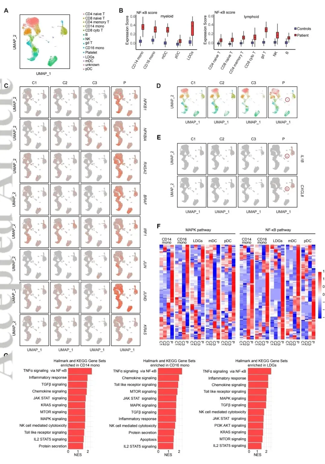 通路富集:GSEA分析证实NF-κB和MAPK通路在患者髓系细胞(尤其是LDGs和单核细胞)中显著富集。