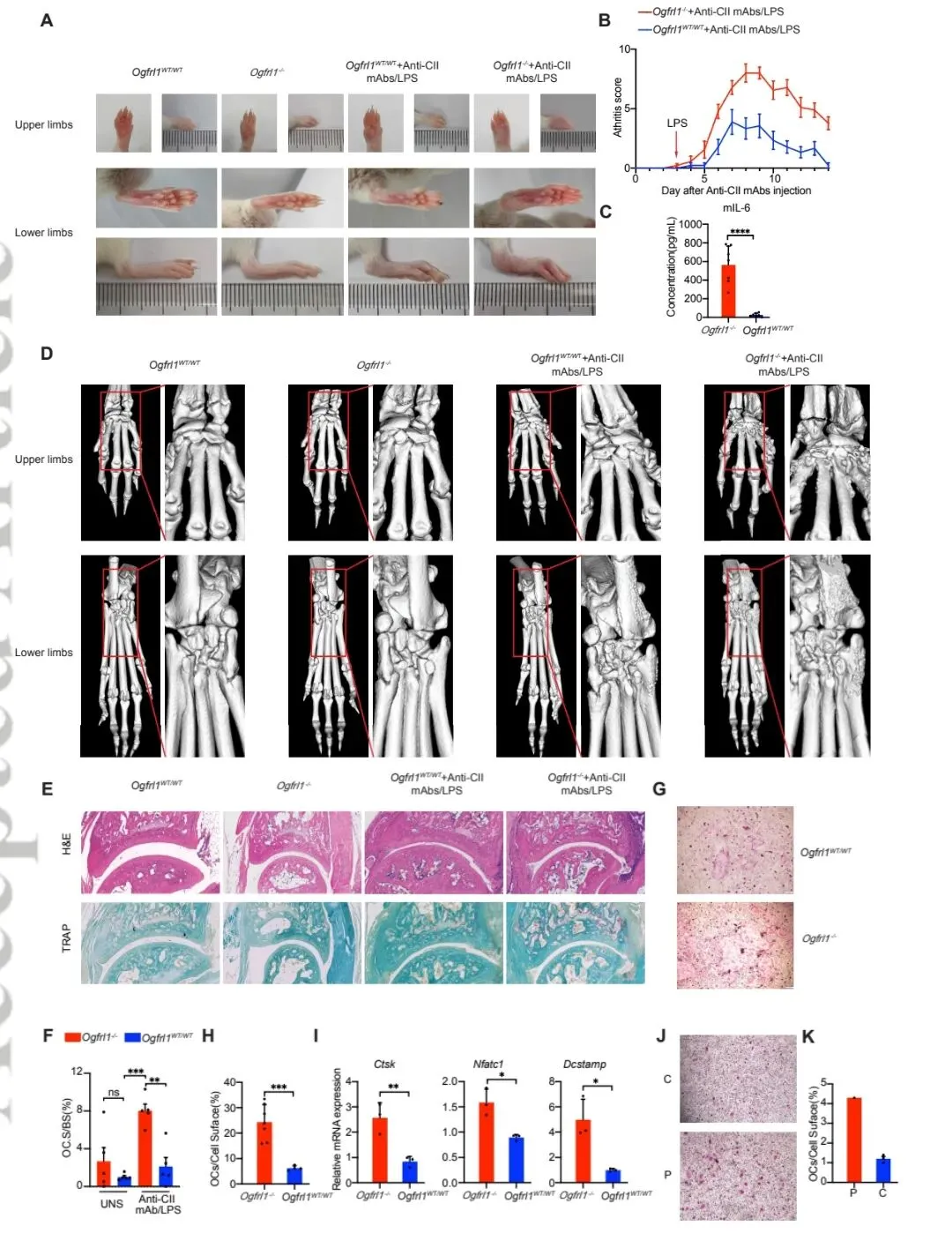 小鼠表型:在胶原抗体诱导关节炎模型中,Ogfrl1敲除小鼠表现出更严重的关节肿胀、血清IL-6升高、更明显的骨侵蚀以及更严重的关节炎症细胞浸润和破骨细胞生成。
