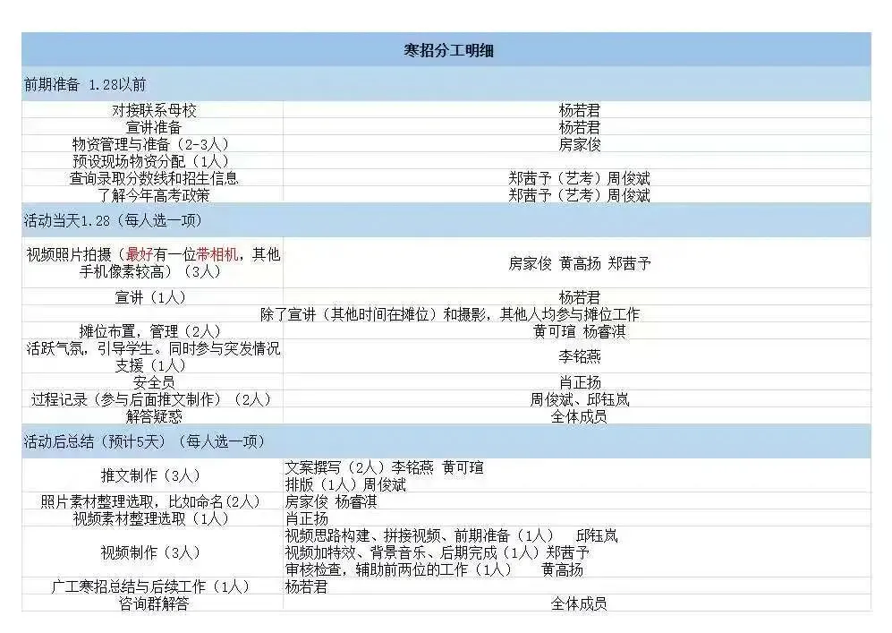 寒招筹备阶段,我们的队长代表团队参加了深二外组织的线上培训会议。会上,母校老师详细讲解了“学长带我‘游’大学”游园活动的各项注意事项,包括现场流程、互动规范与应急方案。队长会后第一时间向团队同步了会议要点,并让大家根据自己的的特长和意愿填写分工计划表,为寒招活动的有序开展筑牢了基础。