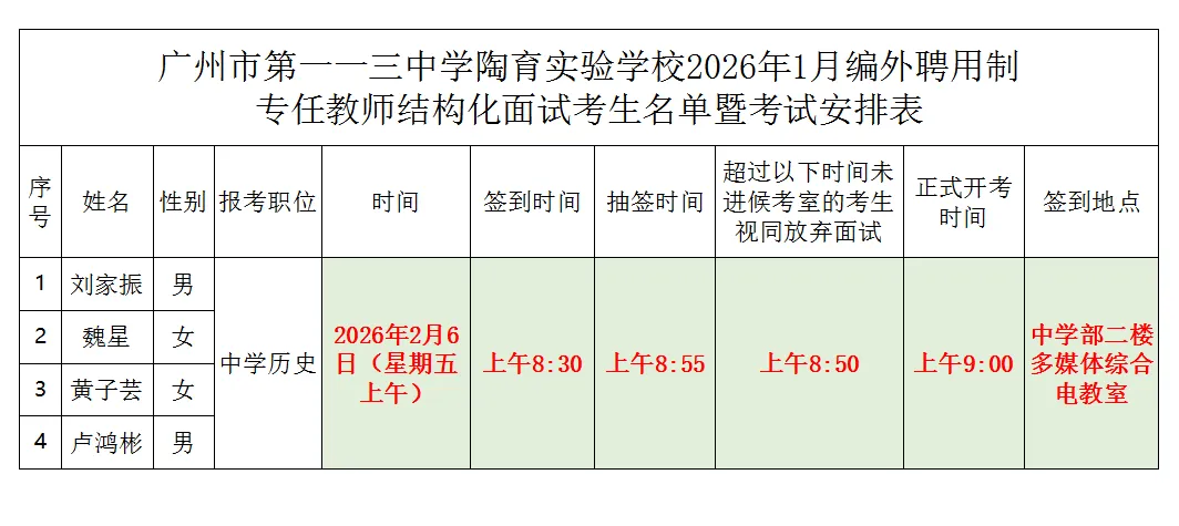 广州市第一一三中学陶育实验学校2026年1月编外聘用制专任教师报名及资格审查工作已完成,现将结构化面试名单予以公布,并将考试有关事项公告如下: