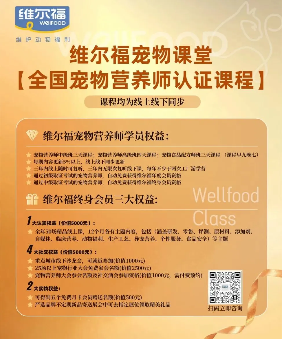 维尔福宠物营养师课程,专为希望系统提升专业能力的宠物从业者与爱宠人士设计。课程内容覆盖宠物发展、犬猫生理结构、营养需求、适口性与加工工艺等多维度知识,帮助您构建完整的营养学知识框架,跨越认知断层,实现个人与企业的双向成长。
