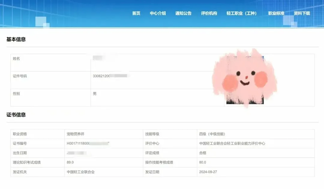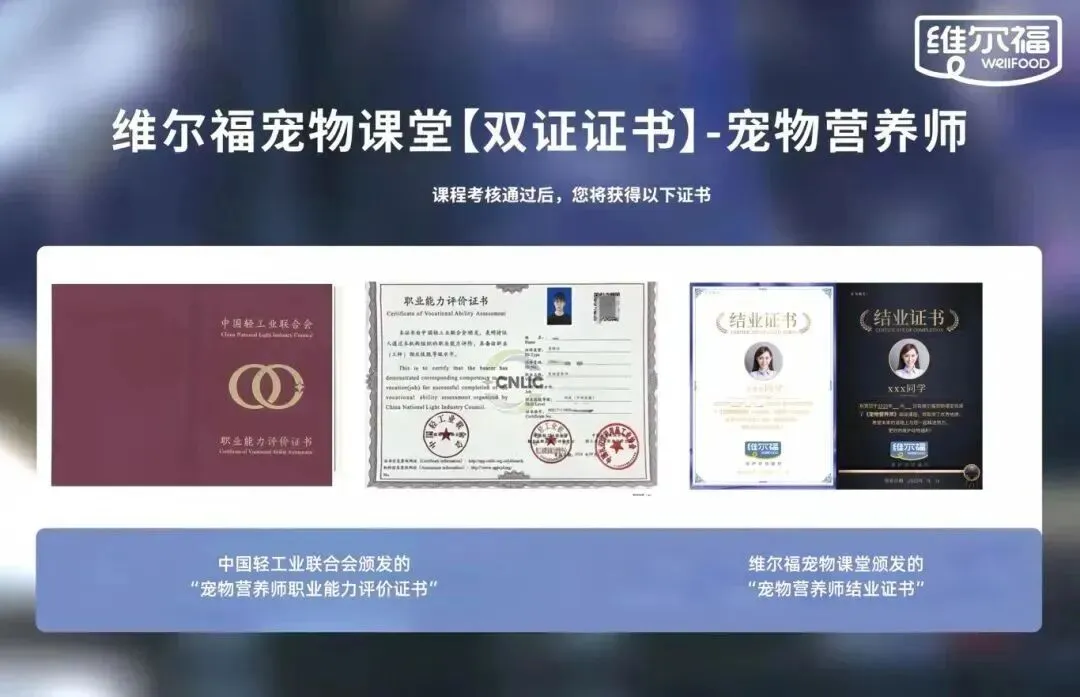 证书颁发:中国轻工业联合会“宠物营养师职业能力评价证书”
