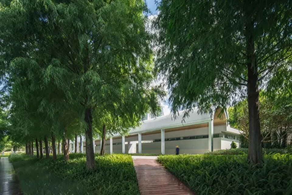 建筑前的水杉步道,笔直的水杉竖向和建筑折板屋顶,共同风格化了作为“绿色生态工程场所”的几何特征,也形成了一条有经营潜力的园中街道。
