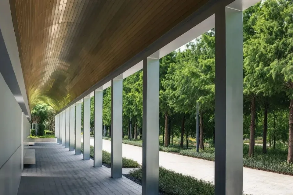 拱廊立柱与水杉林疏密呼应,截面采用梯形增加光影变化,立柱采用有金属反光质感的涂料,希望可以强调此处光影颜色的特殊性。屋面局部采用种植屋面,将建筑与场地绿化融合。