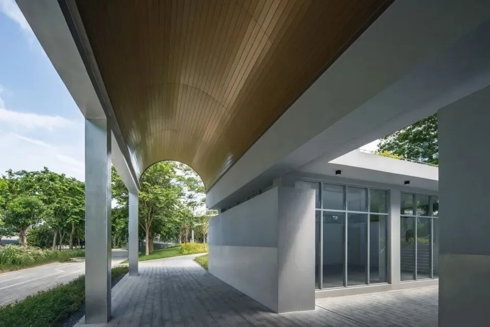 从内侧河道反观,建筑呈现连续的门廊挑檐空间,吊顶采用欢迎的暖色,是淡水湿地景观的活跃边界,为游人提供休息和驻足的灰空间。