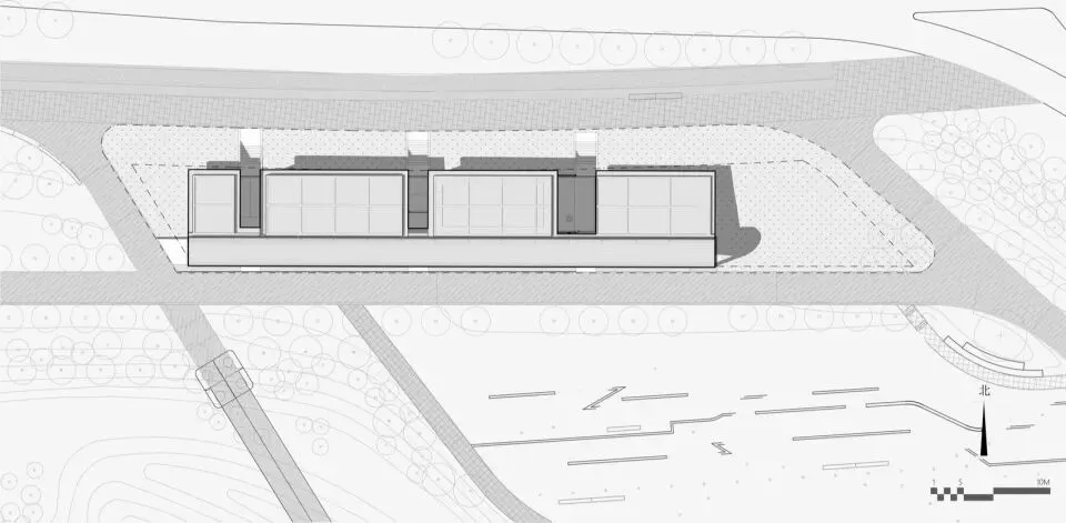 驿站一位于桂湾公园露天剧场一侧,公园规划此处露天剧场将成为周边企业展示,居民聚会的场所。建筑布局在此,意图提供剧场未来需要的服务配套支撑,功能为洗手间及封闭演练/展览空间。方案通过增加面向舞台的挑檐灰空间,将建筑嵌入剧场地景,成为景观剧场的最后一排。
