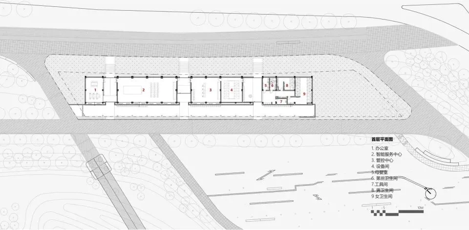驿站三位于桂湾公园水杉湿地一侧,这片水杉林是桂湾公园秋冬季节的特色植物景观。建筑原本功能策划为洗手间及消控室及智慧机房,是相对消极的公园服务功能。方案通过增加一条面向水杉林的拱形长廊,活跃建筑界面,提供游人休息场所,同时也成为公园里一座具有精神性的拱形廊道,与成排的水杉林形成安静有力的场所关系。