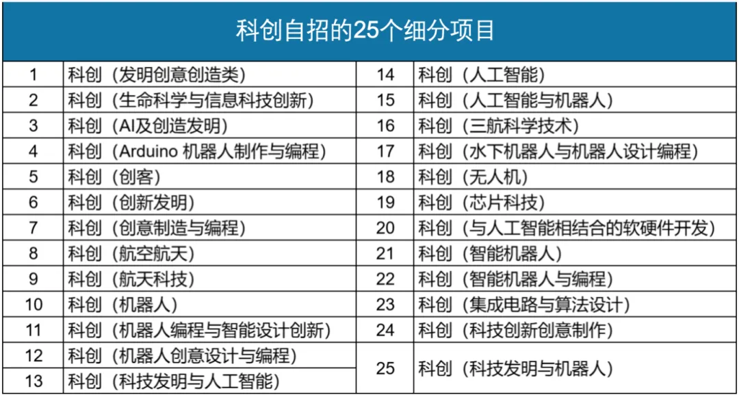 涵盖 AI、机器人、创新发明、航空航天、无人机、芯片科技等领域,比如科创 (人工智能)、科创 (机器人编程)、科创 (集成电路与算法设计) 等,特长精准的考生可直接对标报考。