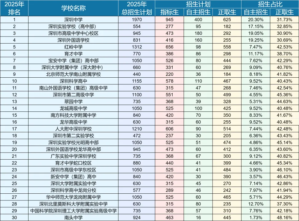 2025年自招计划9708人,占普高招生计划的9%,较2024年增加801人,创历史新高。其中四大名校自招占比突出:深圳中学20.3%、深圳外国语学校19.25%、深圳市高级中学中心校区19.05%、深圳实验学校(高中部)17.15%。