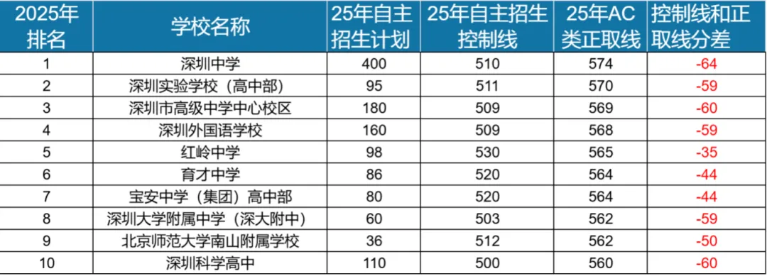 2025年十大高中自招控制线与正取线最大分差达64分,例如深圳中学自招控制线510分,正取线574分,降分优势明显。