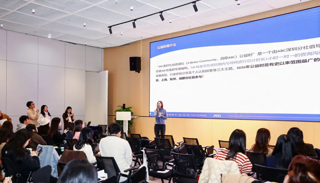 “ABC美好社会咨询社(A Better Community,简称ABC)公益时”是一个由ABC深圳分社倡导并发起的公益项目,也是ABC校友的专属福利。