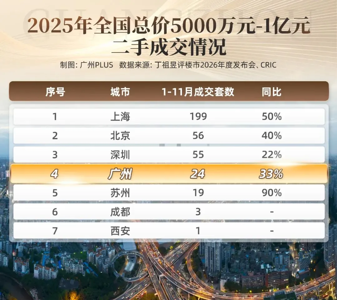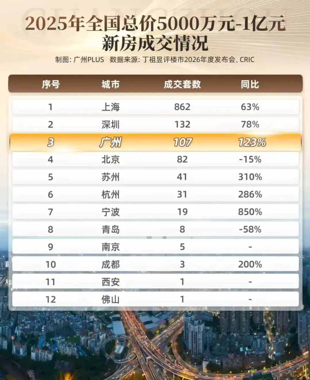 在刚刚过去的2025年,似乎整个房地产市场都在喊救命,大家都以为富人的口袋也捂紧了。全国的豪宅市场,不仅没凉,还走出了让人侧目的独立行情。5000万级豪宅,广州有107套成交,同比暴涨123%,成为所有一线城市中最高增速。相比之下,北京下滑15%,杭州基数小虽增长快但总量仅31套。更惊人的是亿元豪宅,广州去年卖出6套总价过亿新房,虽然同比有所回落,但注意,全中国仅6个城市有此记录!具体来看单盘。