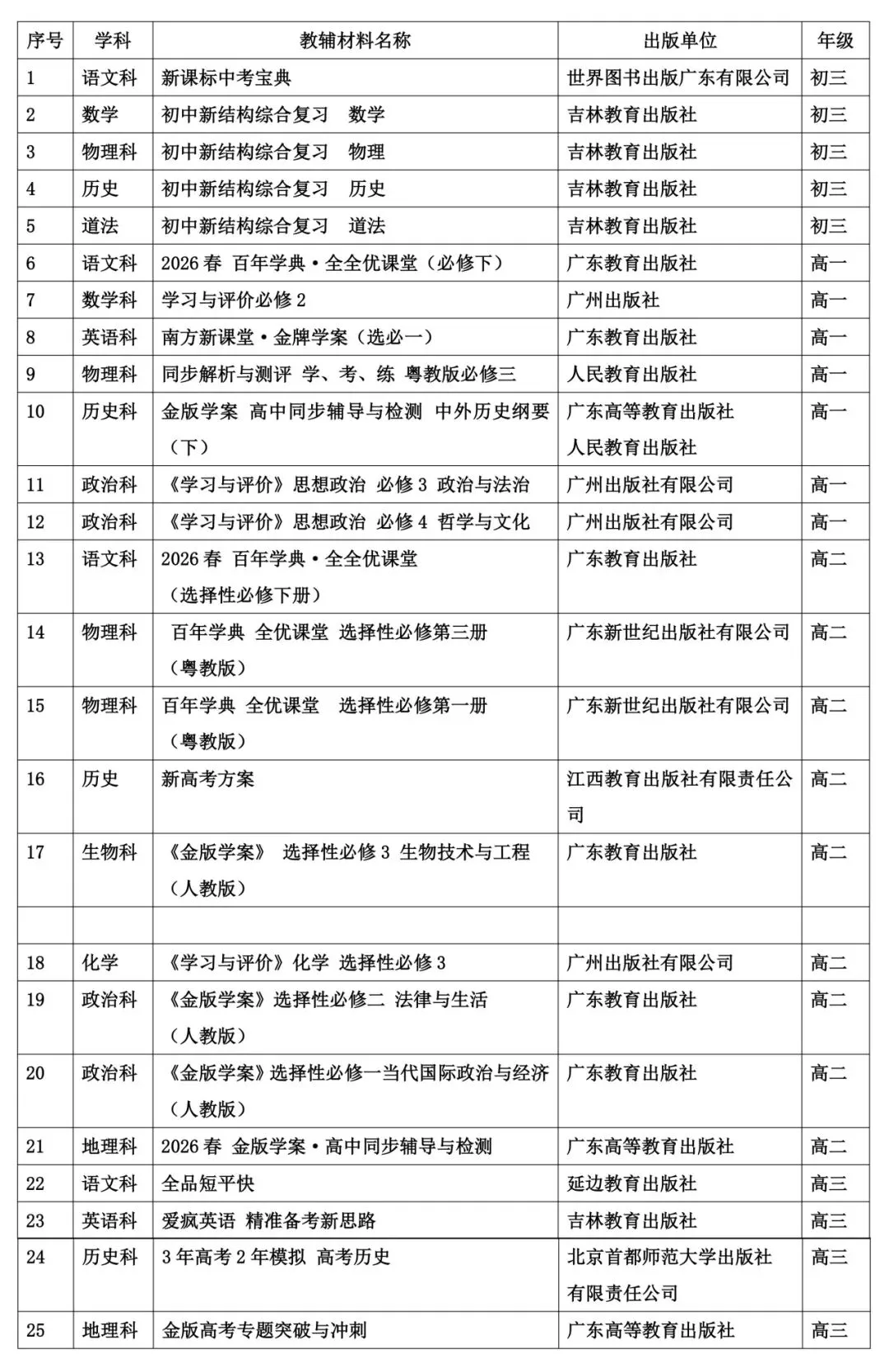 2.所有选用教辅均来自《广东省2025年初高中教辅材料共享目录》,无目录外产品。