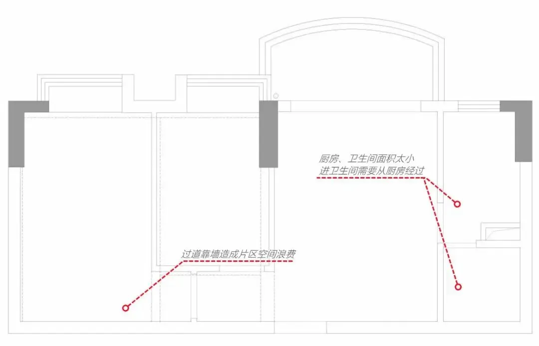 除开主卧,每个空间的面积都很小,最棘手的是厨、卫,除了小,进入卫生间还必须经过厨房,用着难受不说更是浪费空间。