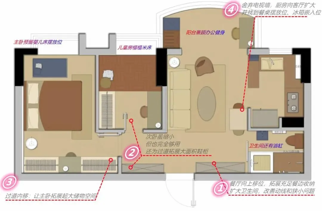 可以看到,因为扩大过道,而缩小面积的次卧(儿童房)空间依然够用。