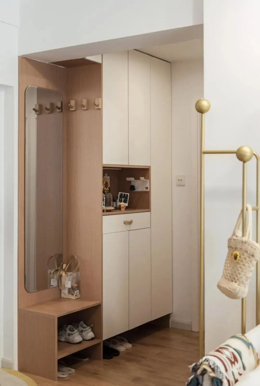 除了温馨原木风的色调,鞋柜设计也是可圈可点,挂衣区、换鞋区、常用鞋子收纳区、陈列区一应俱全,整洁干净满满的生活气息。