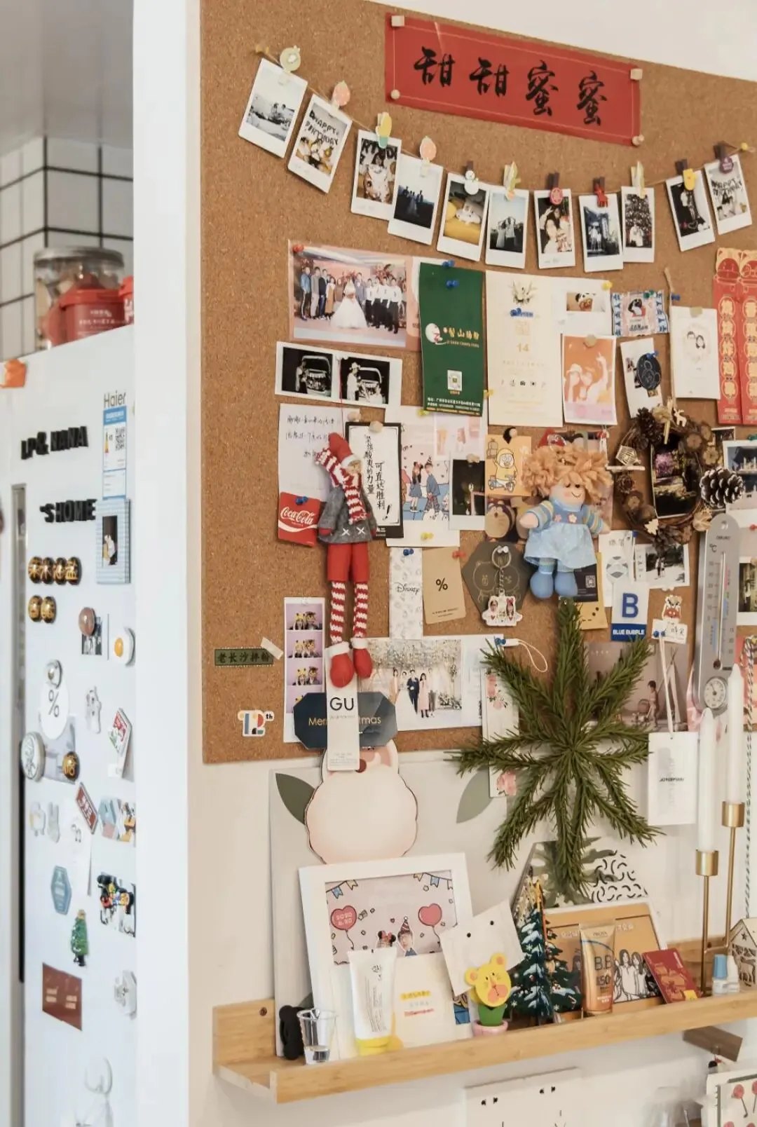 热爱生活的夫妻俩,也很注重生活的乐趣和仪式感,瞧这餐桌上方半面墙,都被他们利用了起来,打造了一个小杂物、照片、便签的收纳区。