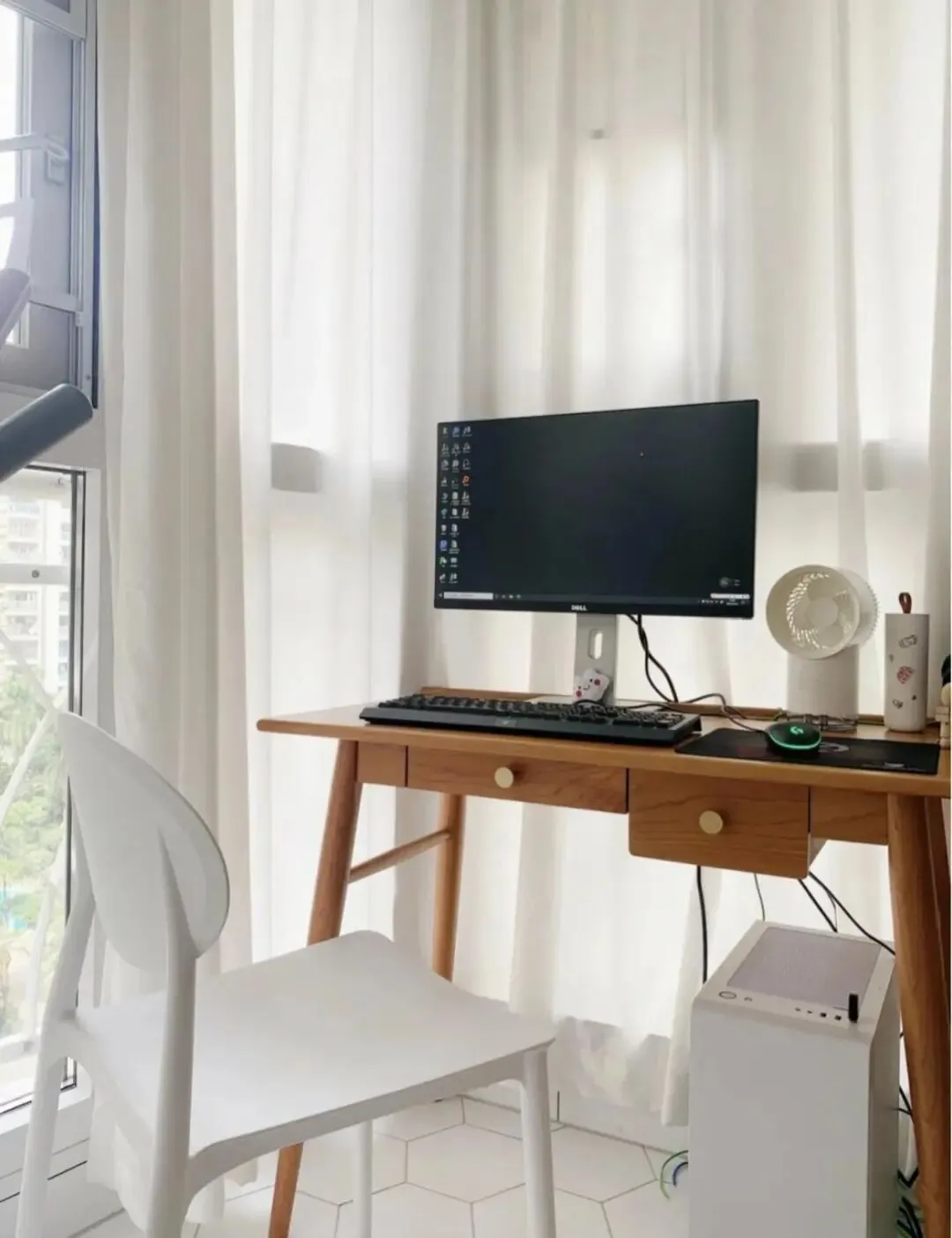 右侧建筑结构的凹槽区,恰好够空间摆放一个单人书桌,在这里设置了一个临时办公区,不出门打打游戏,偶尔在家加个班处理一下工作都是不错的。