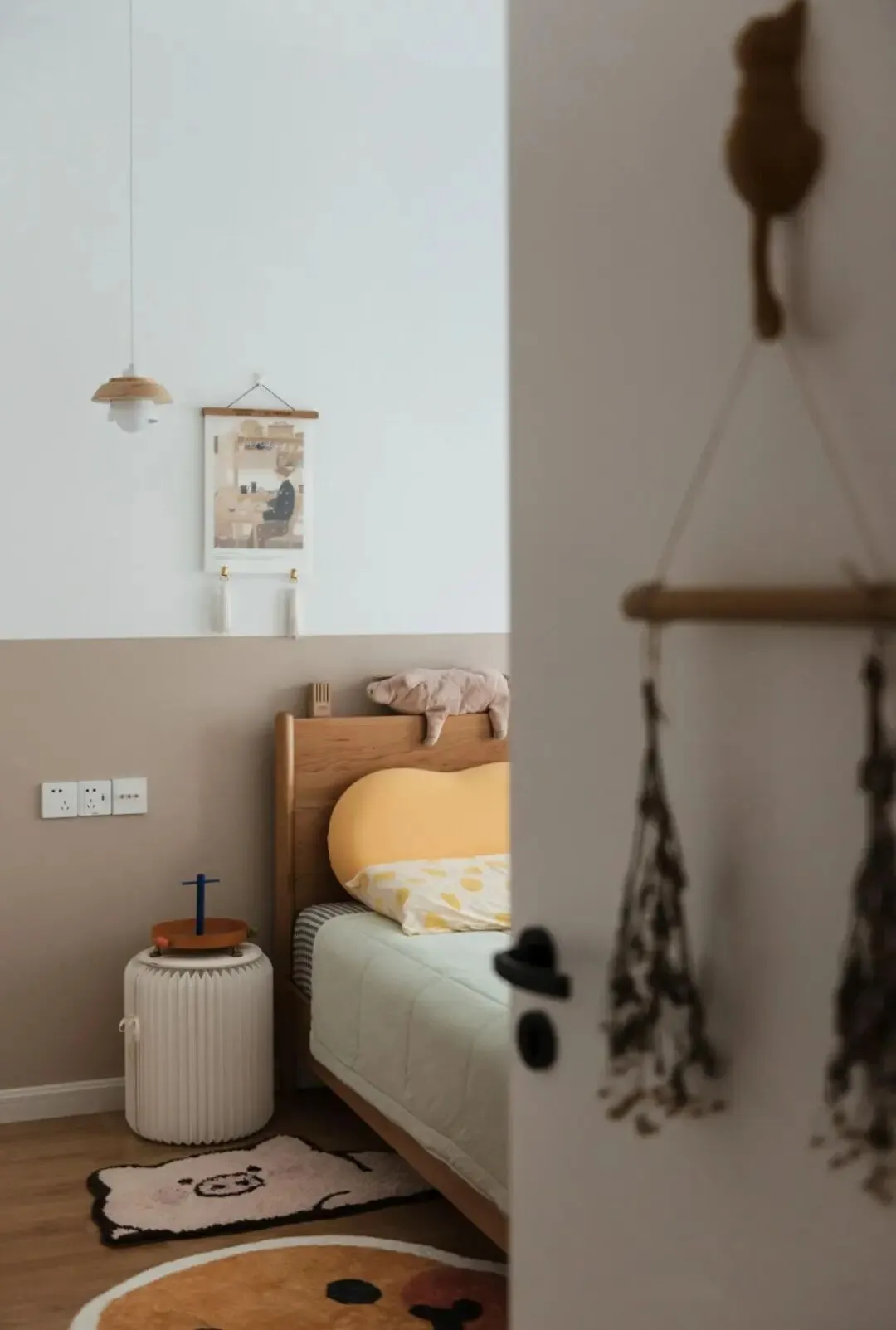 奶咖色的乳胶漆拼刷白色乳胶漆,让整个床头背景墙简约有层次,大地色系带来的踏实感搭配原木家具让人感到无比踏实。