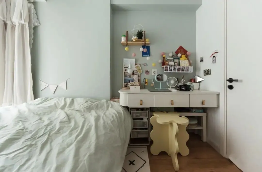 女主人需要的梳妆台也预留了出来,椅子不用时可以放在台桌下面,很赞。