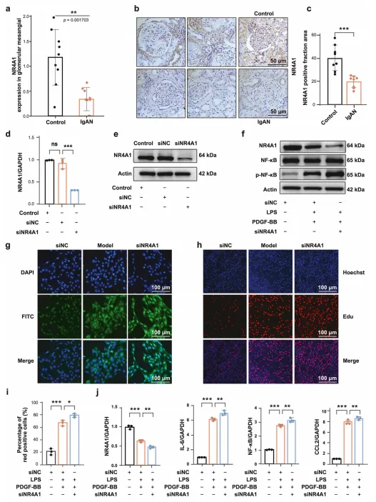 - 临床样本分析显示,IgAN(MsPGN 最常见类型)患者肾组织中 NR4A1 mRNA 和蛋白水平显著降低,且与肾小球滤过率呈正相关。