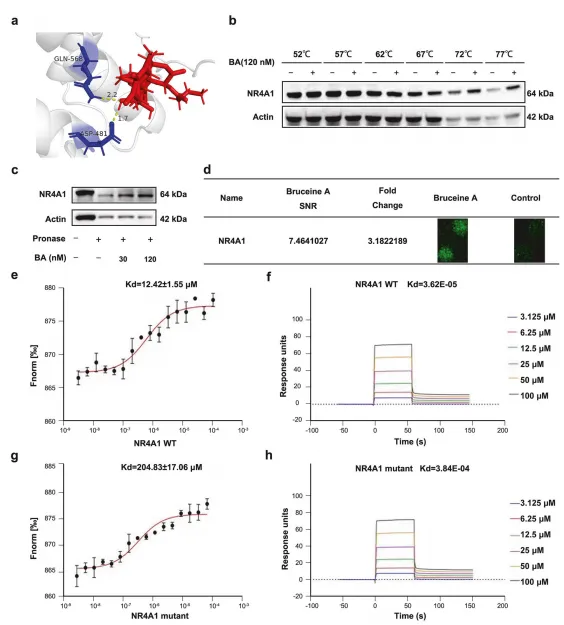 - MST、SPR 实验证实,BA 与野生型 NR4A1 的解离常数(Kd)分别为 12.42 μM 和 3.62×10⁻⁵ M,而 D481A/Q568A 突变会显著降低结合亲和力。